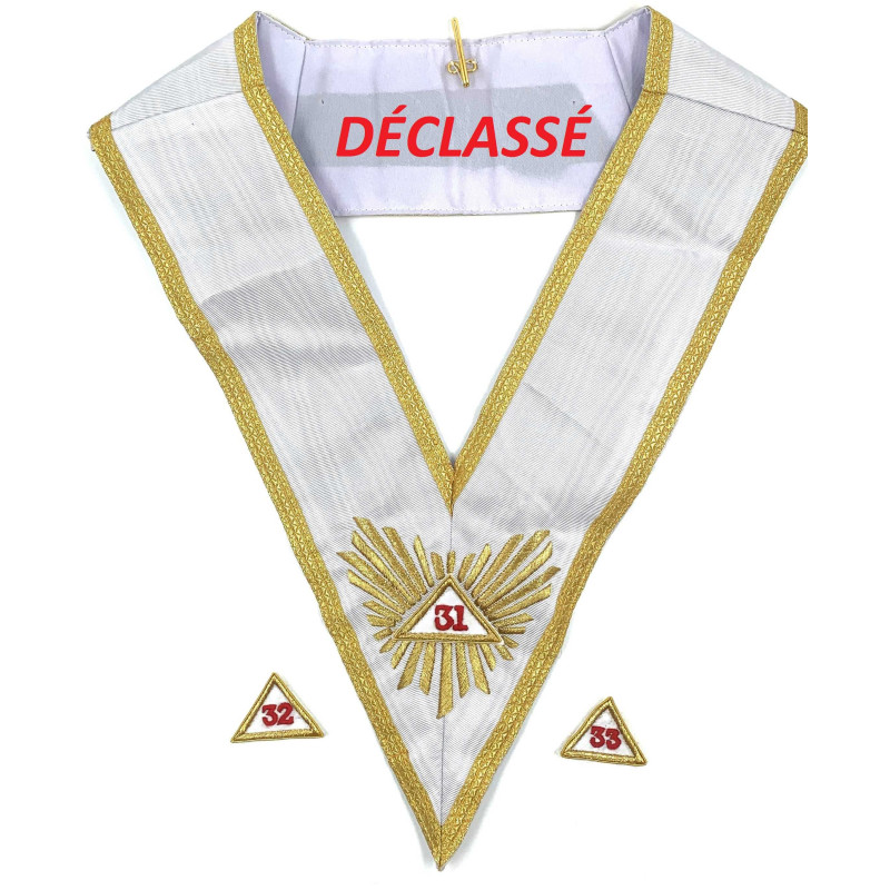 Malin : Les triangles brodés 31 - 32 - 33 sont interchangeables pour ce sautoir de ruban moiré blanc brodé or et livrés avec le sautoir. Les 3 triangles brodés peuvent être achetés séparément au prix de 6.90€ / pièce