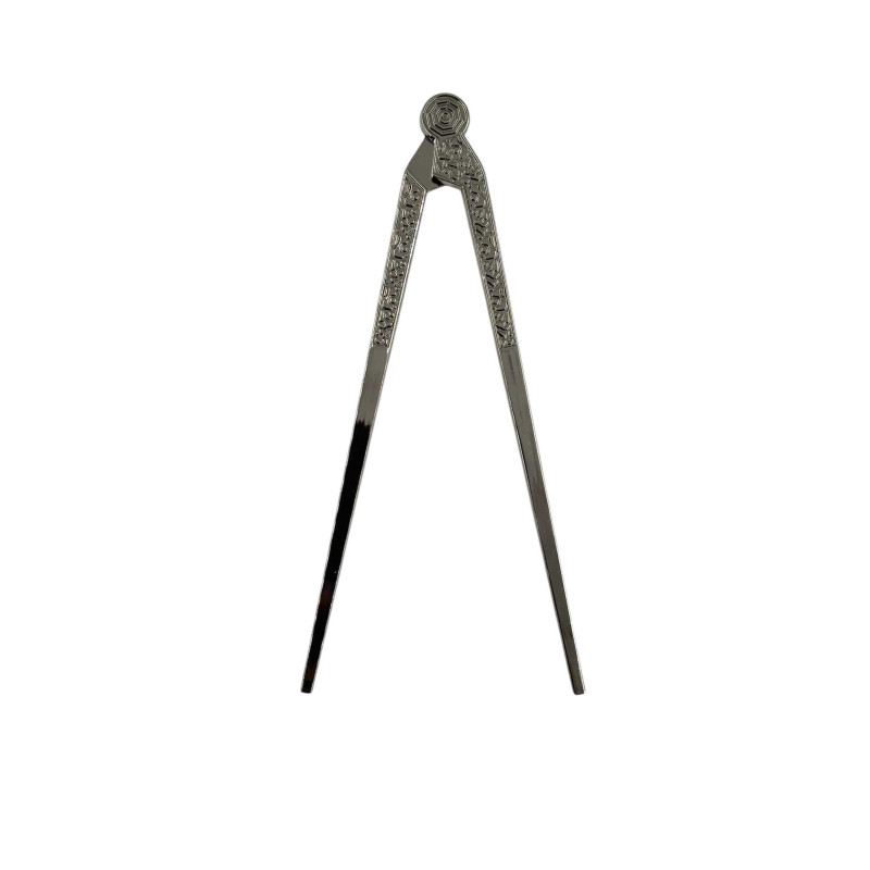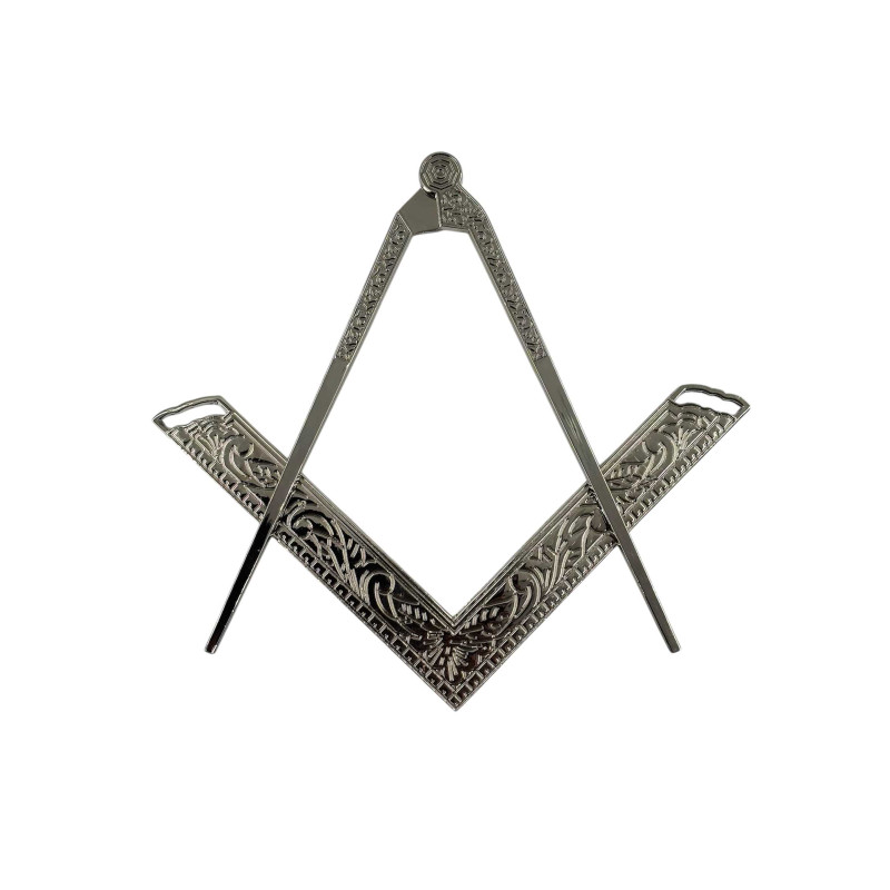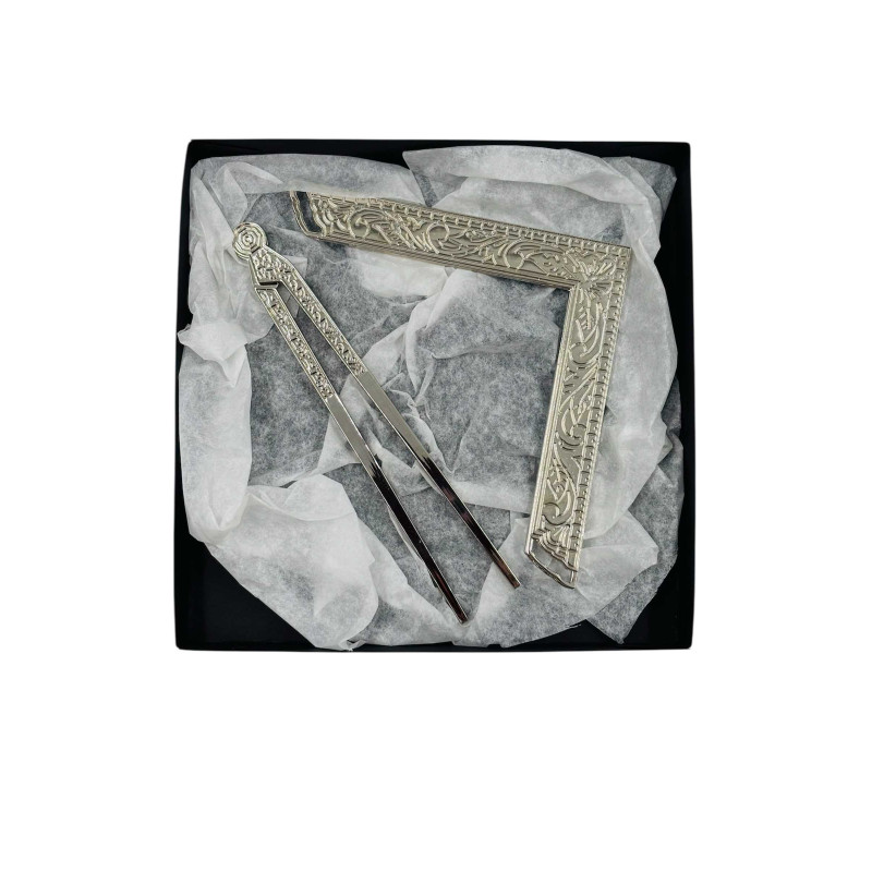 Equerre et compas de Loge en métal argenté ouvragés en coffret.